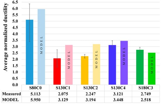 The average ductility values of each specimen type (which are detailed above) together with their corresponding model predictions are presented in Figure 14. The figure shows that the model’s ductility has the highest agreement with the average experimental ductility of types S130C4, and S180C3 specimens, i.e., the hybrid specimens with the highest amount of CFM.