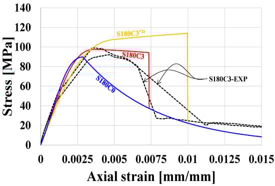 An examination of the contribution of the CFM amount in a hybrid confinement system is illustrated in Figure 15 for the case of steel ties spaced at 180 mm, i.e., with a transverse steel reinforcement ratio of 0.79%. For the control specimen (without CFM) with this spacing, a calculated curve has been generated (denoted as S180C0 in the figure), relying on the model’s good prediction of the tested control specimen with 80 mm spacing (see Figure 12a). Figure 15 shows this curve together with both the measured (denoted “EXP”) and calculated stress–strain curves of the hybrid specimens. It shows that compared to the control S180C0 specimen, the addition of the CFM confinement at teq = 0.285 and 0.570 mm (S180C3 and S180C3*2t in Figure 15, respectively) leads to a calculated increase in the peak stress, from 89.8 to 97.5 and 113.9 MPa (respectively).
