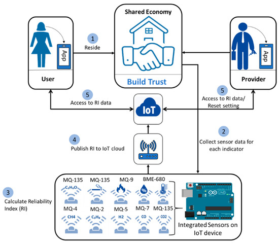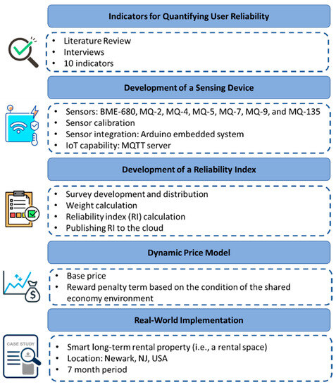 Therefore, this paper addresses the research needs identified and fills the existing knowledge gap by developing an intelligent IoT device to quantify the reliability of the users of shared economy systems with a focus on shared properties (i.e., shared rooms or apartments in buildings). The associated objects include: (1) identifying and understanding the different indicators that could be used to assess the reliability of shared economy systems; (2) creating a quantifiable metric or measure that could be used to numerically quantify the reliability of shared economy systems, and (3) formulating a dynamic pricing model that dynamically establishes the rental price of the shared economy system according to the calculated reliability. Finally, expanding from the literature on indoor environmental assessments, this study aims to explore the applications of indoor environmental condition-related aspects in a shared economy system. Specifically, this study creates an IoT-enabled prototype device, develops a user reliability index and a dynamic pricing scheme, and builds a cloud-based platform to share information with stakeholders in a shared economy environment. This study aims to effectively reduce economic losses and damage, efficiently allocate resources, enhance trust, and ultimately stimulate the concept of the shared economy in smart cities.