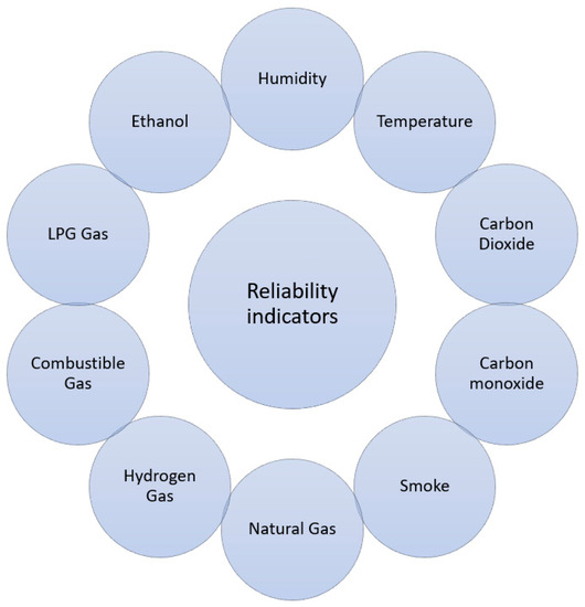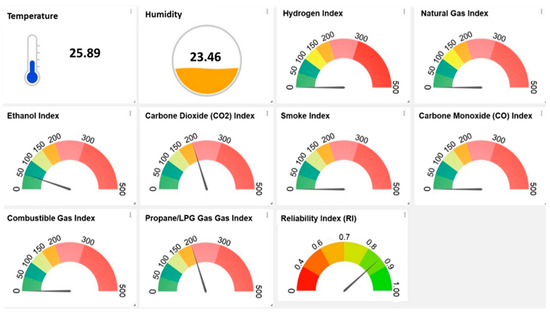 A total of 7 sensors were integrated into the smart device to measure the different indicators. More specifically, the “BME-680” sensor was used to collect the following two indicators: temperature and relative humidity. The MQ-2, MQ-4, MQ-5, MQ-7, and MQ-9 sensors were used to collect the data for the following 5 indicators: LPG gas, natural gas, hydrogen gas, carbon monoxide, and combustible gas, respectively. Finally, the MQ-135 sensor was used for the remaining 3 indicators: ethanol, smoke, and carbon dioxide.