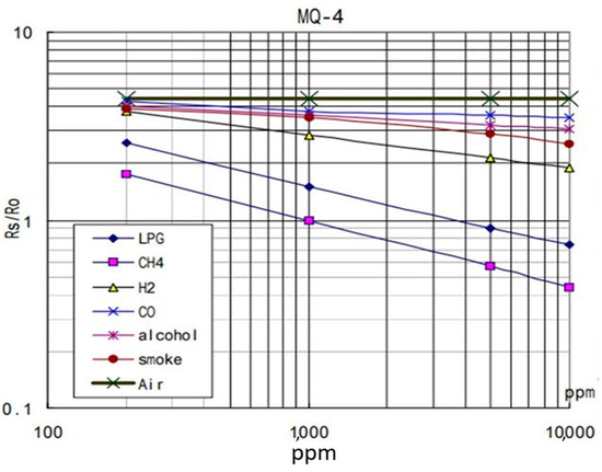 The sensor’s accuracy depends on the sensor’s resistance ratio (), where is the sensor’s resistance which varies according to the measured concentration, and is the sensor’s resistance at a known concentration (i.e., without other gases or in fresh air). To calibrate the sensor, the ratio in fresh air must be determined, and the ratio for each sensor can be found in the manufacturer’s datasheet. Taking the MQ-4 as an example, the in fresh air is 4.4 (see the green line labeled “Air” in Figure 3). To this end, all sensors in this study were calibrated accordingly.