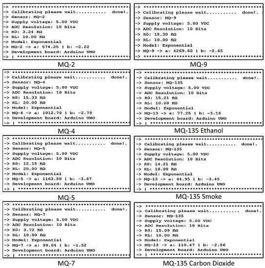 The values of , a, and b for each of the MQ sensors in this study and their corresponding indicator(s) are shown in Table 2.