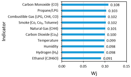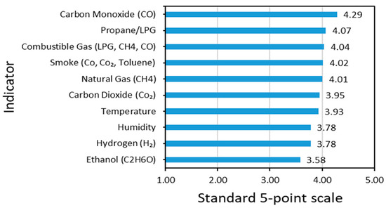 As detailed in the Methodology section, a 5-point Likert scale was used to assess the significance of the 10 indicators, and the average point for each indicator j (i.e., ) from the 71 responses is provided in Figure 6. The 71 respondents indicated that carbon monoxide (CO) is the most critical with an average of 4.29/5, and ethanol (C2H6O) is the least critical with an average of 3.58/5.