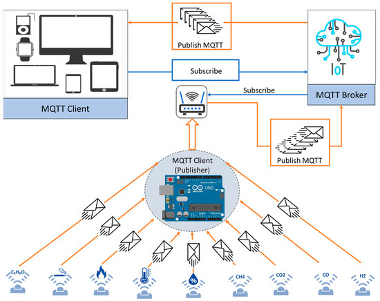 Specific features were considered when developing the sensing device, including high sensitivity, fast response, high reception accuracy from different distances, simple drive circuits, long lifespan, and low cost. In terms of accuracy, the “BME-680” sensor was selected to collect the following two indicators: temperature and relative humidity. The “MQ” sensor family was selected and used in this study to collect real-time data for the other 8 indicators. These sensors are made up of an electrode which is coated with a sensing material and heated to be more reactive and sensitive. More specifically, the MQ-2, MQ-4, MQ-5, MQ-7, and MQ-9 sensors were used to collect the data for the following 5 indicators: LPG gas, natural gas, hydrogen gas, carbon monoxide, and combustible gas, respectively, while the MQ-135 sensor was used for the remaining 3 indicators: ethanol, smoke, and carbon dioxide.