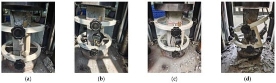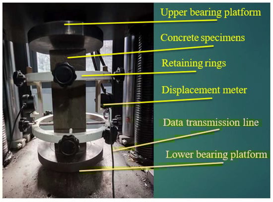 The uniaxial compression test was carried out by YAW-2000D-type pressure testing equipment. Using the displacement control method, the loading rate was 0.03 mm/min. The high-precision linear variable displacement transducers (LVDT) were used to continuously obtain the deformation of the specimen during loading with the accuracy of 1 µm. The data acquisition frequency was 8 Hz. The transducer was set at the position of 1/3~2/3 of the specimen, as shown in Figure 1. To prevent the stress concentration during loading due to the unevenness surface of the specimen, precompression and alignment were performed before formal loading, and the preloading value was 30% of the peak load. Then, the formal loading was applied continuously until the deformation reached 3 mm.