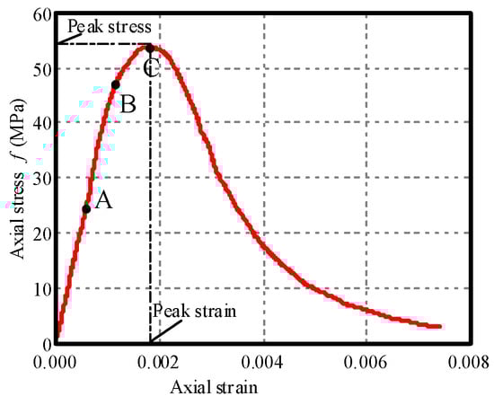 Axial compressive stress–strain curve of classical manufactured sand concrete specimens. Point A is the elastic limit point, point B is the plastic limit point, and point C is the peak stress point.