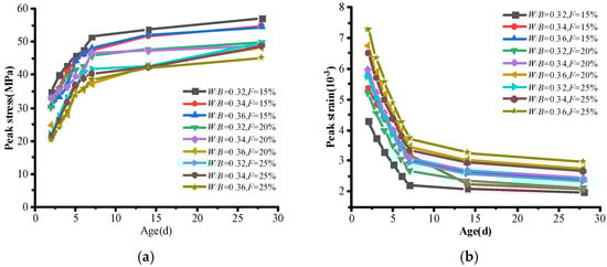 At the age of 2d, 3d, 4d, 5d, 6d, 7d, 14d, and 28d, the peak stress and peak strain of manufactured sand concrete was obtained with the variation of water–binder ratio and fly ash admixture, as shown in Figure 4. Along with the increase in age, peak stress grew up with two obvious stages. In the first stage, the peak stress increased at a quick pace from 2 days to 7 days. The average increment of peak strain was about 20 MPa. After that, the growth of peak stress was relatively slow from 7 days to 28 days, and the average increment was only 8 MPa. As for the peak strain, it decreased with the increase in age. The peak strain changes most dramatically between 2 and 7 days. After 7 days, the variation in peak strain tended to level off from 7 days to 28 days. This indicates that the peak stress and peak strain are dramatically influenced by age, especially the early age period. The cement gel’s creation and hardening reaction eventually finish, increasing the concrete strength. Before 7 days, the hydration reaction is stronger so that the peak stresses increase quickly. After 7 days, the concrete is more likely to crack under high load because the cracks’ expansion rates are faster, leading to a more rapid failure process.