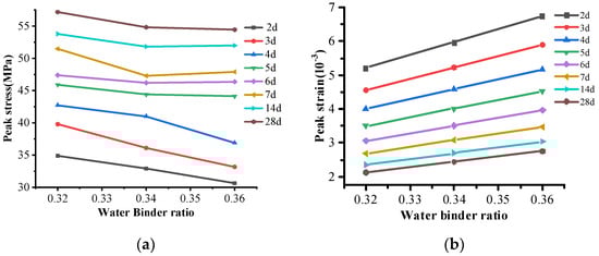 Variation in peak stress and peak strain with water–binder ratio in each test group; (a) peak stress; (b) peak strain.