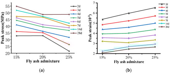 When the fly ash admixture increases from 15% to 25%, the variation in peak stress and strain of manufactured sand concrete is shown in Figure 6. The peak stress decreases with the increase in fly ash admixture. With different curing ages, the variation in peak stress presented some differences with the increase in fly ash admixture. At the age of 2d to 3d, it is small when the fly ash admixture increases from 15% to 20%, but it changes greatly (a decrease at about 10 MPa) when the fly ash admixture increases from 20% to 25%. Along with the increase in curing age, the peak stress changes less from 15% to 20% than that from 20% to 25%. As for the peak strain, it increases linearly with the increase in fly ash. Similar to the tendency of water–binder ratio, the peak strain changes obviously at the early age. When the fly ash admixture increases from 15% to 25%, the change in peak strain is about 1 × 10−3 at the ages of 2d to 4d, while it is about 0.5 × 10−3 at the ages of 5d to 28d. This finding shows that the relationship between peak stress and strain and fly ash admixture is limited by the curing age, especially the early age. The effect of fly ash on concrete properties is mainly expressed in two aspects. First, the appropriate amount of fly ash improves the fluidity of fresh concrete, reduces the phenomenon of water bleeding, and improves the compactness of concrete by optimizing the pore structure distribution of hardened cementitious paste []. Second, excessive fly ash can adversely affect the construction properties of fresh concrete and the pore structure of hardened concrete, which can lead to a decrease in mechanical properties and durability.