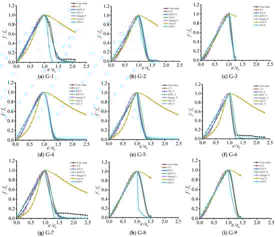 The test curve is compared with the curve of each model. In the figure, J-Y represents the Carreira model, TH-Y represents the Wee model, KHY-Y represents the Yang model, Sargin-Y represents the Sargin model, Guo-Y represents the Guo model, and GB-Y represents the GB 50010-2010 model.