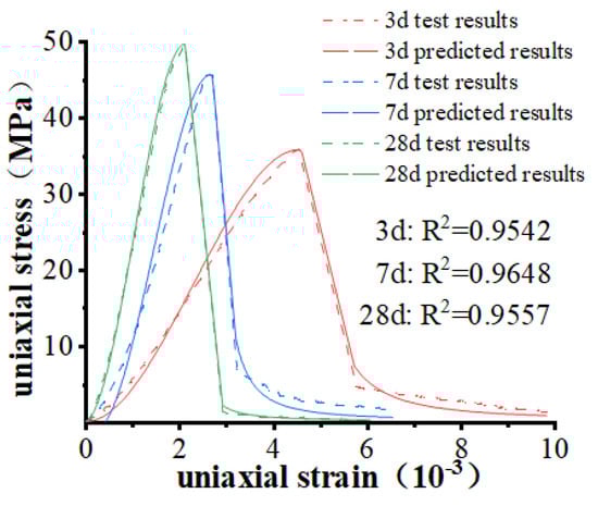 Therefore, the stress–strain curve at the corresponding age can be predicted by the constitutive model, and the peak stress and peak strain data of concrete at that age can be obtained to judge whether the next stage of construction can be carried out.