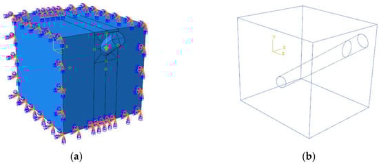 The model’s dimensions are 4 m in the Z-direction and 3.5 m × 3.5 m in the X–Y section. Figure 9a depicts the coupling effect between the crawling cone and the midpoint of the concrete’s X–Y face. The loading method employed in the model is displacement loading, which allows for control of the external force applied to the model. This method effectively simulates the actual loading conditions. By considering the coupling effect, the accuracy of the simulation results is significantly improved.