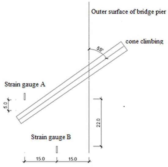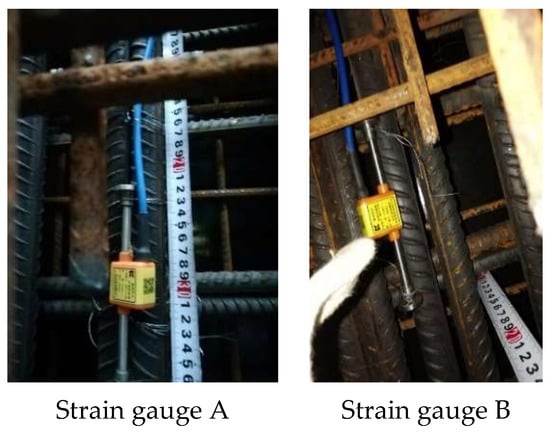 Due to the complexities involved in the crawling formwork and reinforcement tying on the construction site, it was not feasible to place strain gauges directly on the concrete surface near the crawling cone. To address this challenge, pre-buried strain gauges were employed in the concrete near the crawling cone. Specifically, strain gauges A and strain gauges B were buried in the end part of the crawling cone, as illustrated in Figure 10. The pre-buried strain gauges utilized were intelligent string strain gauges manufactured by Changsha Golden Code Company (Changsha, China) (Figure 11). The measurement apparatus used was a comprehensive tester also provided by Changsha Golden Code Company. This approach allowed for effective strain measurement while minimizing disruption to the construction process.