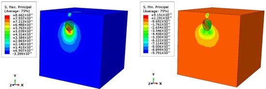 The stress field clouds depicted in Figure 12 at different ages illustrate a significant increase in stress at the contact point between the crawling cone and the concrete at the age of 3d. This can be attributed to the intense hydration reaction of the concrete at earlier ages, which means that the concrete’s strength does not increase instantaneously. Consequently, the resistance of the concrete is relatively weak at this stage. As the concrete reaches the ages of 4d and 5d, the hydration reaction becomes more stable, leading to a substantial increase in overall strength. Consequently, the concrete’s ability to withstand external forces is enhanced. Furthermore, variations in stress distribution within the concrete can also be observed at different ages, which influences the performance of the concrete.