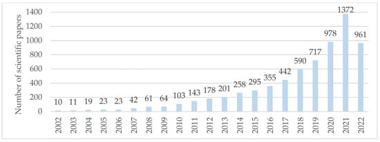 Number of articles concerning sustainable concrete studies per year. Time-span 2002–2022. Results were obtained using the keyword “sustainable concrete” inside the Web of Science database, selecting only the “article”, i.e., scientific paper, items.
