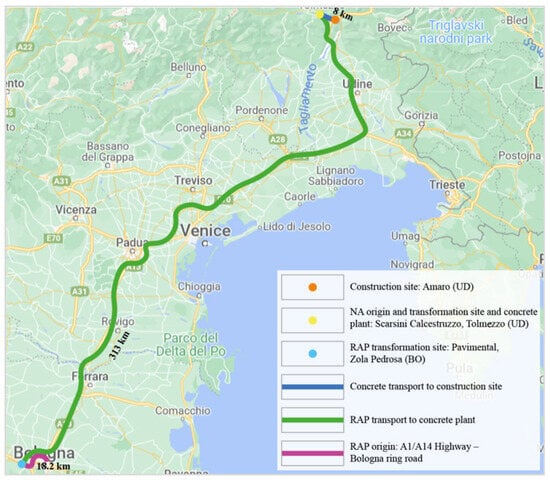 With respect to the sites of aggregate origin, the RAP was considered to proceed from the ordinary maintenance of the Bologna ring road. Following Italian regulations and prescriptions [,], the wear course thickness was assumed to be 6 cm. On the other hand, the NA quarry was selected as closest as possible to the building construction site, the Scarsini Calcestruzzi situated in Tolmezzo (UD) (Figure 2).