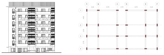 The building structure is made of reinforced concrete, composed of seven levels and a 6x4 structural grid (Figure 3). The structural design was performed to meet the requirement of the Italian Building Code [] and a concrete strength class of C28/35 was chosen.
