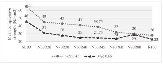 Mean compressive strength values for two different w/c ratios (0.45 and 0.65) and for increasing percentages of RAP: 0% (N100), 20% (N80R20), 40% (N60R40), 45% (N55R45), 60% (N40R60), 80% (N20R80) and 100% (R100). Adapted from data contained in [].