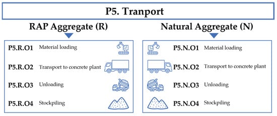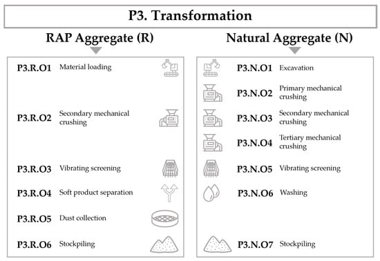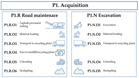 The bituminous conglomerate waste derives from road maintenance/demolition operations. In this contribution, it was hypothesized to use only the material deriving from road maintenance of the wearing course of the selected highway (Section 2.2). As NA the quarry aggregate production was considered. Therefore, the acquisition phase was found to be quite similar for the two aggregates and composed of six and five operations for RAP and NA respectively (Figure 7). Specifically, the first operation (P1.R.O1/N.O1) concerns raw material obtainment, i.e., asphalt milling for RAP and quarry extraction for NA; operations 2 and 3 are the same for the two aggregates and coincide with the loading of raw material onto trucks (P1.R.O2/N.O2) and its transport to the transformation plant (P1.R.O3/N.O3); the payment of the recycling fees interests only RAP (P1.R.O4/); whereas the two conclusive operations, equal for the two aggregates, coincide with unloading the material (P1.R.O5/N.O4) and its stockpiling within the plant (P1.R.O6/N.O5).