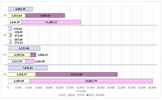 The selection led to the three mix designs reported in Table 5, which were used to perform the cost analysis. As previously stated, the three admixtures were all characterized by a water-to-cement ratio of 0.45 and had the following aggregate composition: (i) 100% natural aggregate (mix N100); (ii) 70% of natural aggregate and 30% of RAP aggregate (mix N70R30); and (iii) 55% of natural aggregate and 45% of RAP aggregate (mix N55R45).