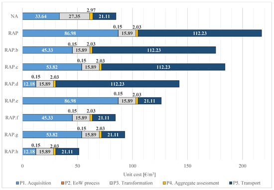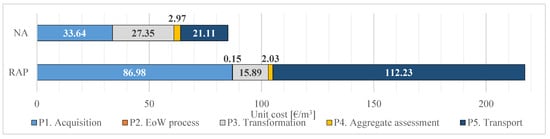 Concerning RAP P3 (transformation) and NA’s phases P1 (extraction) and P3 (transformation) costs, the assessment method used by [,] was followed.