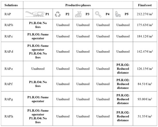 Once the parameters Ci, CE, PED, FED and CT were calculated as previously stated and applied to the apparatuses whose characteristics were described in [,], the total cost of each phase, namely RAP transformation (P3), NA acquisition (P1) and transformation (P3), was defined and was then applied to the case study to evaluate the economic impact of the NA substitution with RAP.