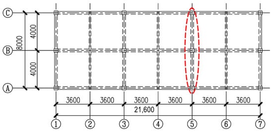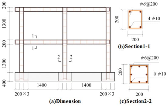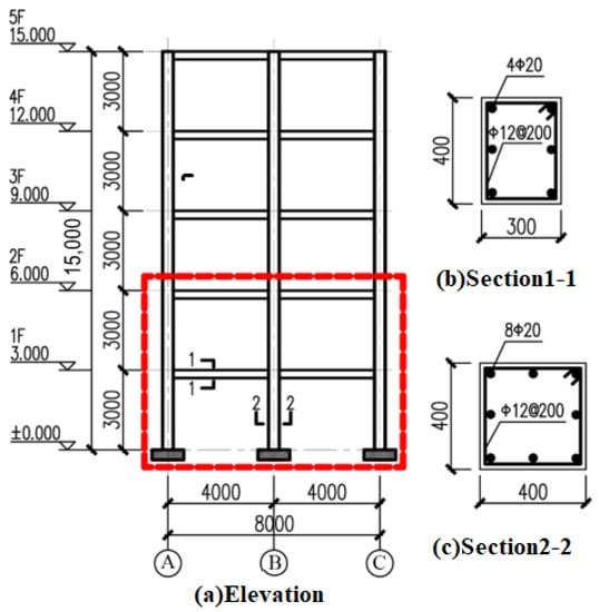 In this study, the prototype of a five-storey, two-span RC frame was designed based on the SATWE analysis, as shown in Figure 1. The overall height and width of the test frame were taken as 15,000 mm and 8000 mm, respectively. The cross sections of all the columns were 400 × 400 mm, whereas the cross sections of the beams were 300 × 400 mm. The elevation and reinforcement diagrams are shown in Figure 2. In this test, the bottom two layers of the frame were selected and the similarity ratio was set to 1:2. Figure 3 shows the outlines and reinforcement detailing of the specimens. The percentage of steel reinforcement required in column sections was 1.57%, while the percentage of steel reinforcement in the beam sections was 0.52% for tension and compression sections, respectively. Twelve-millimeter diameter reinforcements were used as column and beam stirrups at a constant spacing of 200 mm c/c. Two types of specimens were used: the strengthened type and its counterpart.