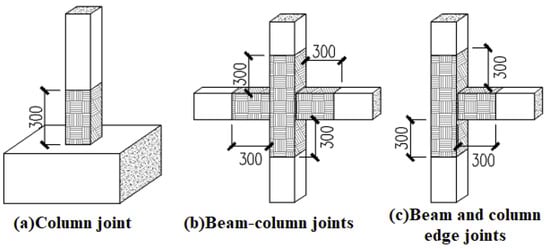 The strengthening scheme was carried out based on the specifications described in [], as shown in Figure 4. The detailed strengthening steps are as follows: (I) Surface treatment of the predetermined reinforcement section is carried out using a grinding machine, as shown in Figure 4a; (II) The roller in the bottom resin evenly coats the concrete surface of the predetermined reinforcement section, as shown in Figure 4b; Then the beam-column corners are chamfered—the chamfering radius is 20 mm; (III) Three layers of carbon fiber cloth are pasted over a 300 mm length. Specifically, the first layer is longitudinally pasted and then the second and third layers are circumferentially wrapped, as shown in Figure 4c.