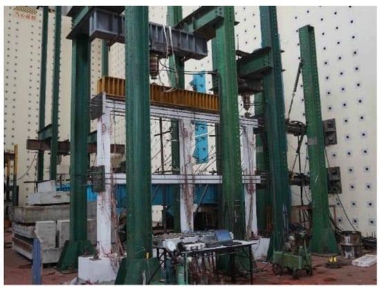 As shown in Figure 5, the test devices consisted of a reaction wall, a rigid floor, two vertical jacks, two horizontal electro-hydraulic servo actuators, a distribution beam and several ground anchors. The specimen was anchored to the rigid floor and tested using the vertical jacks and horizontal actuators. Two jacks combined with the distribution beam were used to apply vertical loads. Two electro-hydraulic servo actuators were used to apply horizontal loads. Both horizontal displacement and force were constantly monitored and recorded by the MTS electro-hydraulic servo loading system.