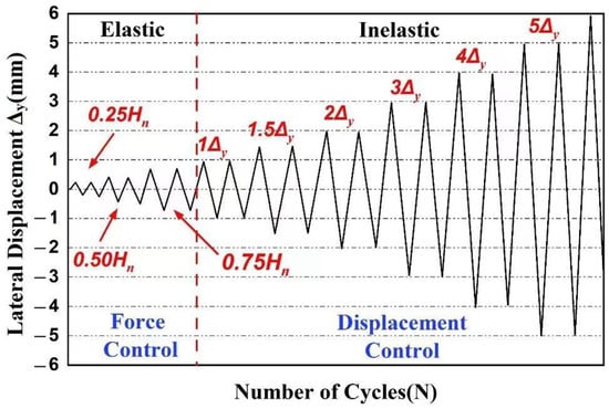 The specimen was subjected to a constant axial compression force and cyclic lateral loading. The cyclic lateral loading was applied based on ATC-24 (ATC1992) [], as shown in Figure 6. The nominal lateral load capacity (Hn) of the specimen was estimated using the plastic stress distribution method. The elastic lateral loading cycles were initially conducted using force control, including two cycles at amplitudes of 0.25 Hn, 0.50 Hn and 0.75 Hn. When the first longitudinal bar of the specimen yielded, the specimen moved to the inelastic stage; then, the damaged specimen was strengthened according to the CFRP retrofitting scheme and further tested in the inelastic stage. Two lateral loading cycles were conducted using displacement control. Specifically, the displacement-controlled loading was adopted at amplitudes of 1Δ, 1.5Δ, 2Δ and so on. The experiment was terminated when the lateral resistance of the specimen was reduced to 85% of the maximum lateral load capacity.