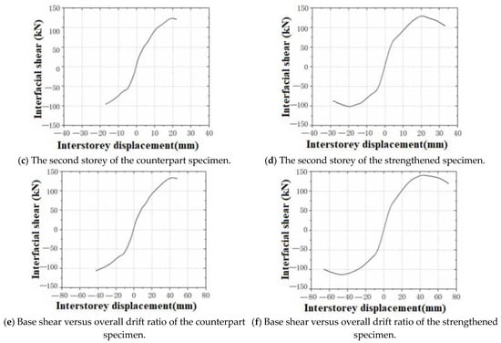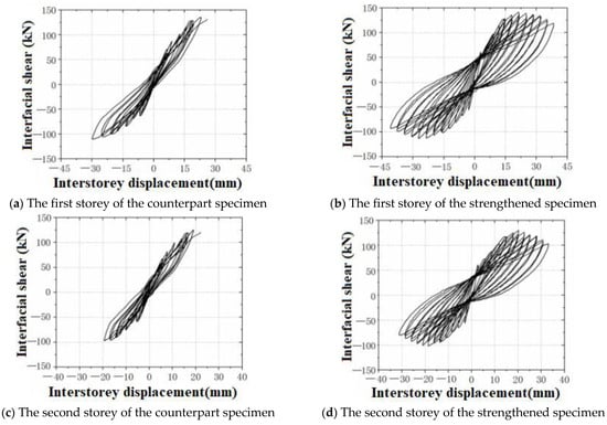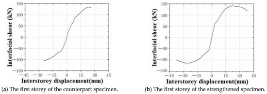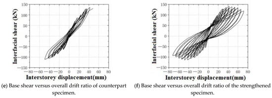 Figure 7a–d shows the storey shear versus storey drift at each storey. Figure 7e,f shows the base shear versus overall drift response (i.e., drift at the top of the specimens). When subjected to a loading amplitude of 3.5Δ, the counterpart specimen exhibited an inverse S-shaped hysteretic ring and the pinching phenomenon was obvious. The counterpart specimen showed more slip and shear failure. The hysteretic curves of the strengthened specimen were plumper than those of the counterpart specimen. This phenomenon suggests that the frames exhibit improved ductility and energy dissipation characteristics after experiencing earthquake damage and then being reinforced with CFRP wrapping.
