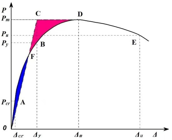 For structural design in engineering applications, the equivalent stiffness is frequently used to evaluate the integral stiffness of frames at different loading stages. Some featured points, including cracking point, yield point, peak point and ultimate point, can be identified in backbone curves, as shown in Figure 9. The cracking point (Point A) represents the first crack appearing in the specimen, where Pcr and Δcr represent the cracking load and drift ratio, respectively. The yield point (Point B) can be obtained using the energy equivalent method (i.e., SOAF = SCDF), where Py and Δy represent the yield load and drift ratio, respectively. The peak point (Point D) refers to the maximum load, Pm and its drift ratio, Δm. The ultimate point (Point E) is equal to Pu (i.e., 0.85Pm), where Pu and Δu represent the ultimate load and drift ratio, respectively. The equivalent stiffness is defined as the ratio between positive load (or negative load) and its corresponding positive displacement (or negative displacement) at featured points. Table 3 lists the equivalent stiffness of the two specimens at different loading stages.