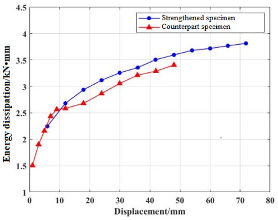 The energy dissipation capacity is an important index for evaluating the seismic performance of the frame. In the pseudo-static test, the cumulative energy dissipation is the accumulated sum of the area of the hysteretic curve envelope of the loading cycle, as shown in Figure 10. The energy dissipation capacity of the strengthened specimen was generally larger than that of the counterpart specimen. This may be attributed to the fact that the CFRP sheets have a restraining effect on the deformation of the specimen. The friction energy dissipation increased the total structural energy dissipation, particularly in the plastic hinge area in the inelastic stage.