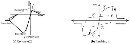 The experimental frame was modeled using the macro-modeling strategy, namely the Open System for Earthquake Engineering Simulation (OpenSees). All the study frames were modeled using the material and geometrical values available in the test. The uniaxial material called Concrete02 was used and the tensile strength of concrete was considered. The compressive strength of concrete was set to 35 MPa and the tensile strength was set to 10% of the compressive strength. The nonlinear monotonic behaviors of concrete beams and column elements were determined using a multi-linear curve. To simulate the pinching behavior and stiffness degradation of material under cyclic loading, the pinching4 material was used in beam and column elements, as shown in Figure 11. Beam and column sections were modeled using fiber sections, which can accurately predict the inelastic behavior of concrete.