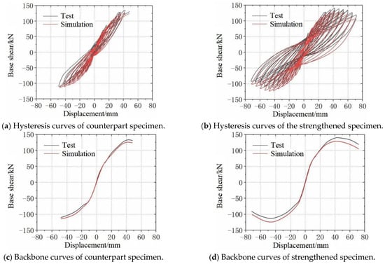In the pseudo-static test, the backbone curve can be obtained by connecting the peak points of each stage of hysteretic curve loading. Figure 8 compares the backbone curves of the strengthened specimen and its counterpart specimen. For the loading curves at each loading stage, the bearing capacity of strengthened specimens was slightly higher than that of its counterpart, indicating that the CFRP wrapping had a positive effect on the frame. The counterpart specimen also reached its peak bearing capacity and failed sharply due to the concrete cracking and the steel bar fracturing, proving the lack of ductility and resilience. However, the strengthened specimen showed an obvious descending trend, suggesting the positive effects of CFRP wrapping on ductility performance.