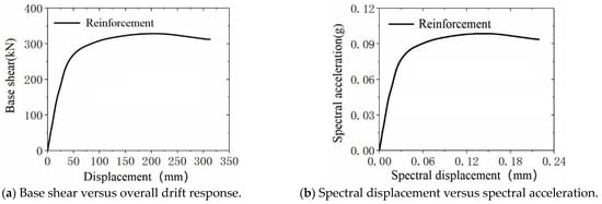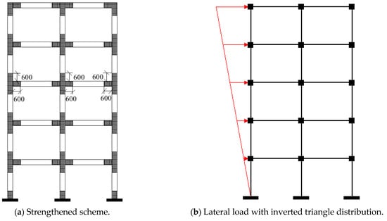 The capacity spectrum method (CSM) is an efficient and reliable seismic analysis tool for structural vulnerability studies. Thus, this study applied the capacity spectrum method to evaluate the improvement of the strengthened method on the seismic capacity of damaged frames. The prototype of the five-storey, two-span RC frame mentioned above was evaluated, as shown in Figure 13. The strengthened scheme is the same as the scaled model but has a length of 600 mm. The lateral load followed the inverted triangle distribution.