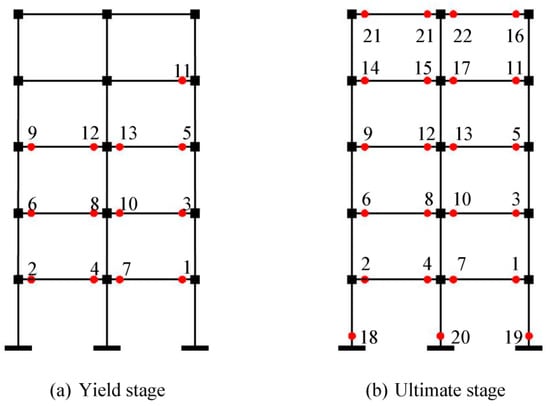 Figure 14 shows the location of plastic hinges developed in both the yield stage and the ultimate stage. The sequences of plastic hinges are marked with numbers. The lateral load increased steadily beyond its elastic limit, and the first plastic hinge appeared at the end of the first-storey beam; this decreased the overall stiffness of the structure and promoted the development of plastic hinges, as shown in Figure 13a. More plastic hinges were formed as the base shear increased monotonically, continuously expanding to the column section. Finally, the plastic hinges moved to the ultimate stage with the failure of the column and fifth-storey beam, as shown in Figure 13b. The failure of the strengthened frame was a typical beam hinge mechanism, which proved the efficiency of the CFRP wrapping scheme.