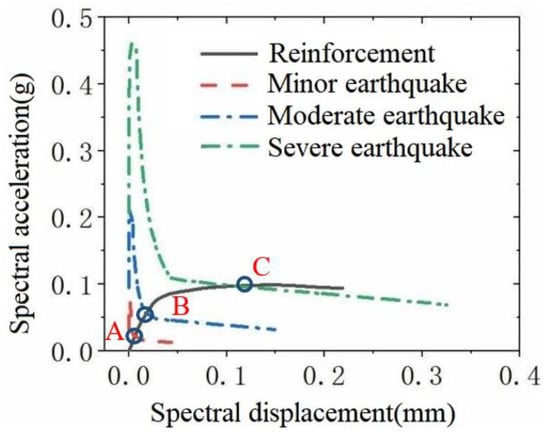 In the Code for Seismic Design of Buildings in China, three-level performance objectives of buildings in seismic-prone regions should be evaluated further, including frequent earthquakes (minor earthquakes), basic earthquakes (moderate earthquakes) and rare earthquakes (severe earthquakes). With the application of the CSM, the capacity spectrum and the response spectrum intersect (Point A, Point B and Point C shown in Figure 16). Different balance points corresponding to three levels of earthquakes were identified. The intersection point is defined as the locus of the performance point. Table 5 lists the results obtained at performance points in three levels of earthquakes. Based on the performance point, the overall performance of the structure can be evaluated to identify whether the strengthened frame can realize the required performance level specified in the seismic design code. In the future, artificial intelligence technologies such as shape-based distance (SBD)-K-medoids [] can be used to analyze and optimize the CFRP strengthening scheme. The systematic method can offer a new approach for efficiently identifying the best CFRP strengthening scheme.
