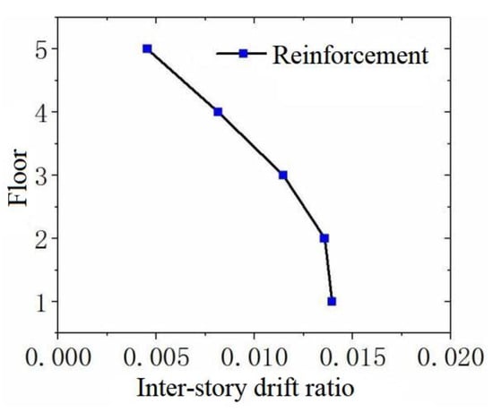 To evaluate the efficiency of the CFRP wrapping scheme, the interstorey drift ratio during a severe earthquake was plotted as shown in Figure 17. The distribution of the interstorey drift ratio as the height increased was non-uniform; in particular, the interstorey drift ratio was higher at lower heights of the structures. The largest interstorey drift ratio (0.013) occurred on the first floor; this ratio is below the limit of seismic specification (i.e., 1/50 in severe earthquakes).