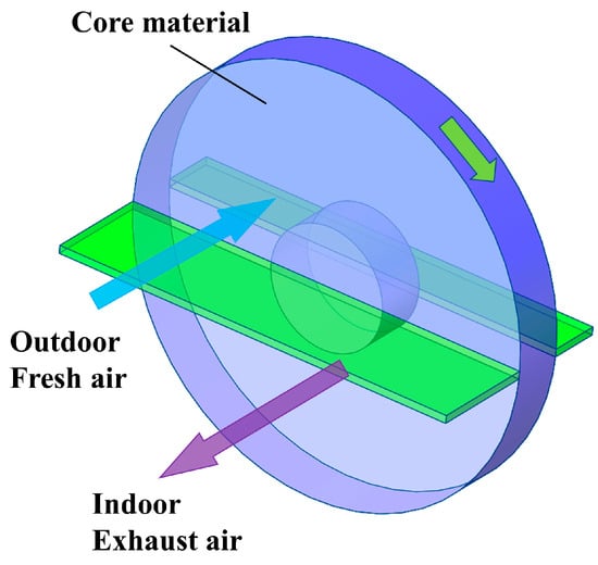Energy wheels play a significant role in building energy conservation because they can reduce the fresh air load of air conditioning systems by recovering energy from indoor air. The results of previous experiments [,] have demonstrated the effectiveness of energy recovery wheels in reducing the fresh air load in both cold and hot climates. Figure 1 illustrates the working principle of energy wheels. Air cleaners are also widely used in building applications, where they play a key role in maintaining and improving the indoor air quality.