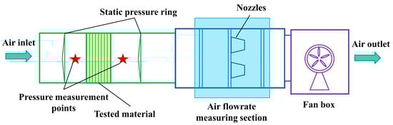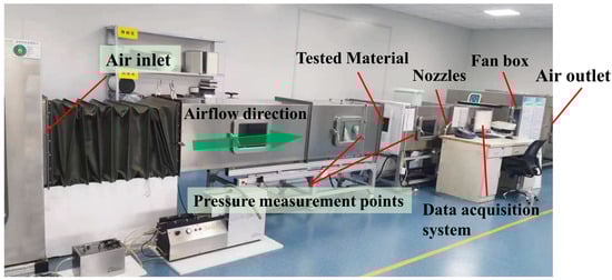 An experimental apparatus was utilized to test the air volume flowrate and pressure drop. Figure 2 and Figure 3 show the schematic diagram and physical diagram of the experimental system, respectively. The system consists of an air flowrate measuring section and a pressure drop testing section, and the measured data can be analyzed using a data acquisition system. The details of the testing method of air flowrates and pressure drop are specified in GB/T 14295-2019 []. The pressure drop of the material was measured using a differential pressure gauge with a range of 0–1000 Pa. During the experiment, measurement points were established on the up- and down-wind side of the tested material to obtain the pressure drop, which can be calculated using the following equation: