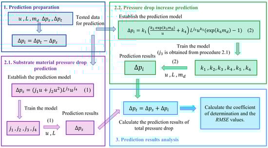 Experimental data are used to train the and prediction model, and the parameters shown in Table 1 serve as the model inputs. With the help of the nonlinear regression method, the unknown coefficients and in the model can be obtained. Coefficients are the unknown coefficients of the substrate material pressure drop prediction model, and are the unknown coefficients of the pressure drop increase prediction model. In the prediction process, coefficients and input parameters u and L are used to calculate the predicted substrate material pressure drop, while coefficients and and input parameters u, L, and are used to calculate the predicted pressure drop increase. The predicted and are the outputs of the substrate material pressure drop prediction model and the pressure drop increase prediction model, respectively.