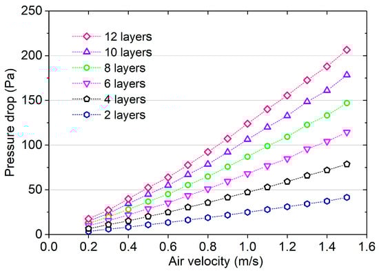 In this section, the pressure drop of the material was experimentally investigated. The impacts of varying the carbon content, the number of material layers, and the airflow velocity on material pressure drop were investigated. Figure 6 illustrates the variation of pressure drop with head-on air speed for different layers of substrate material.