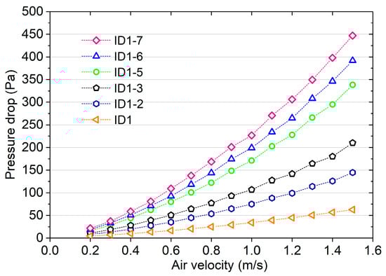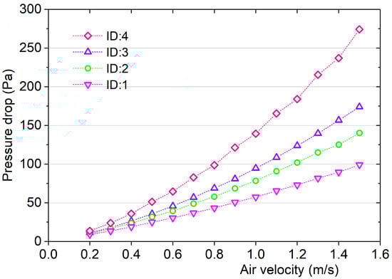 Figure 6 shows that the pressure drop of the substrate material increased with the increase of the airflow velocity and the number of layers of the material, and the pressure drop did not vary linearly with the airflow velocity. For example, for the substrate material with 12 layers, the pressure drop increased from 40 Pa to 92 Pa when the airflow velocity increased from 0.4 m/s to 0.8 m/s, and it further increased to 156 Pa when the airflow velocity increased to 1.2 m/s. Figure 7 demonstrates the variation of pressure drop with airflow velocity of the tested material with different adsorption material amounts. The specific parameters of the four tested materials are shown in Table 2. The relative error of adsorption material amount of each layer material for the same material ID was measured to be within ±8% of the mean value. Test results showed that the adhesion amount of adsorption material has a large effect on the pressure drop. The higher the airflow velocity, the greater the influence of the adsorption material amount on the pressure drop. For example, the pressure drop of the material (ID:4) was about 2.6 times of that of the material (ID:1) when the airflow velocity was 1.4 m/s, while the pressure drop of the material (ID:4) was about 2.2 times of that of the material (ID:1) when the airflow velocity was 0.7 m/s. Test results show that when designing energy wheels and air cleaners with the studied material, the adsorption material amount of the material and the air flowrate should not be too high, as these can lead to excessive pressure drops of the devices and thus to high energy consumption of the fan.