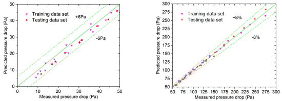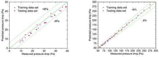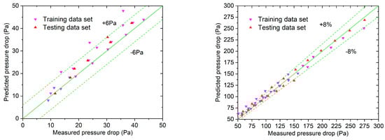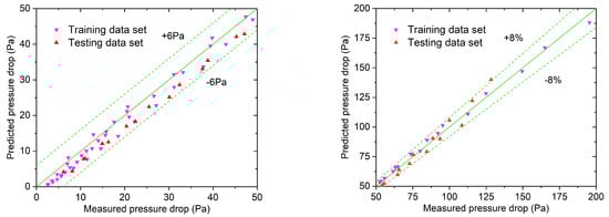 It can be seen from Figure 9 and Figure 10 that when the pressure drop is less than 50 Pa, the absolute error of prediction can be controlled within ±6 Pa for both training sets and testing sets. When the pressure drop is greater than 50 Pa, the relative error of prediction is less than ±8% for most data sets. These data show that the prediction accuracy of the model is acceptable, and it is much higher than that of the previous study on porous materials [].