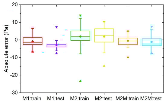 Table 6 shows that the and values of training sets for are less than 3 Pa and 6%, and the values of testing sets are no more than 4 Pa and 7%.