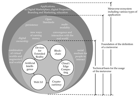 The metaverse is a combination of the real and virtual world, in which applications, such as digital marketplaces, digital properties, branding and marketing, as well as education, are included. The metaverse is based on open standards, digital ownership, persistence, multimodality and social interaction. The technical basis for the metaverse consists of devices for extended reality (XR), blockchain, cloud computing, cryptocurrency, Web 3.0 and artificial intelligence. This definition is shown in Figure 1.