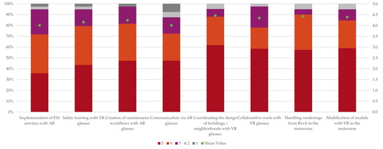 Overall, 49 students visited the workshops and 44 answered the questionnaire to evaluate the workshops. After the workshops, the students were asked to answer various questions. In one of the questions, the students were asked to respond how relevant they think various metaverse tools are for the BIM education in the courses “Digital Design and Construction” and “Building Information Modeling”. The results are shown in the following Figure 4. In this figure, it can be seen that the coordination of the design in VR glasses, the handling of renderings from Revit in the metaverse and the creation of maintenance workflows with AR glasses are relevant use cases for the students. On the other hand, the implementation of FM services with AR and communication via AR glasses are not that relevant for the students.