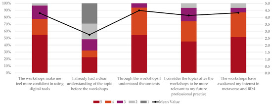 In addition, the students were also asked which parts of the metaverse were improved in their understanding as a result of the workshops. In the case of mixed reality and VR, 100% of the students answered that the workshops improved their understanding, while 97% answered that the workshops improved their understanding of AR. Moreover, the understanding of BIM tools was improved. A total of 94% answered that the workshops improved their knowledge about BIM collaboration software and BIM authoring tools. In contrast, only 52% answered that the workshops optimized their understanding of blockchain.