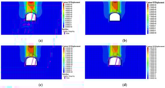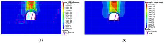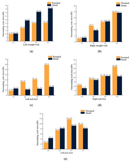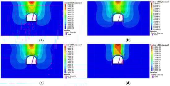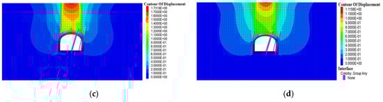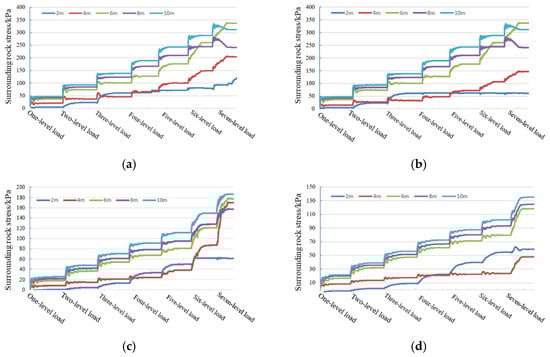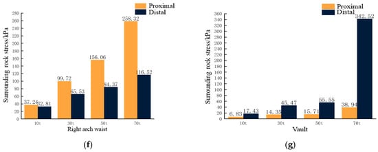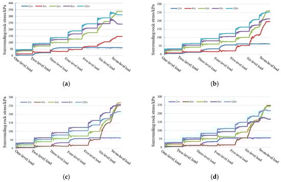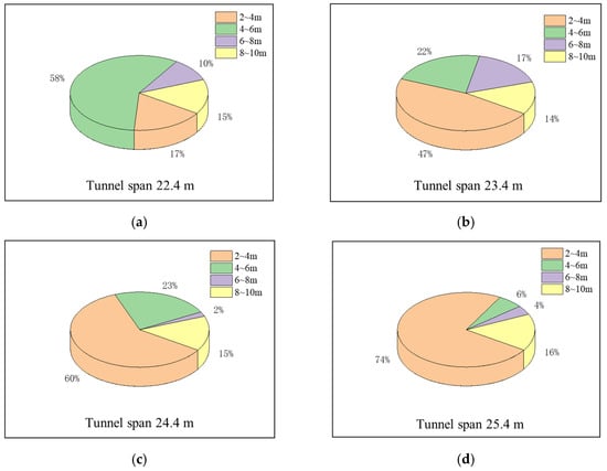 - The thickness of the overlying rock of the tunnel determines whether the phenomenon of stratigraphic arch occurs in the surrounding rock. The formation of stratigraphic arches in the surrounding rock is 4–6 m above the tunnel excavation profile when the overlying rock thickness is 22.4 m, 26.4 m and 30.4 m, respectively, (thickness–span ratio ≥1) at a tunnel excavation span of 22.4 m. When the overlying rock thickness is 18.4 m (thickness–span ratio = 0.82), the stress diffusion process of the surrounding rock under the overlying load cannot be completed better, and the arch effect is not formed in the stratum.